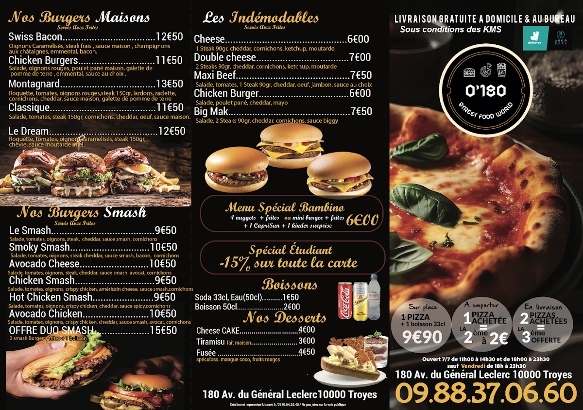O'180 is a cozy eatery located at 180 Avenue Du Général Leclerc De Hautecloque in Troyes, Grand Est. This restaurant offers a variety of dishes ranging from classic pizzas like the Pimento with chili Thai sauce, mozzarella, chicken, pepperoni, and hot peppers to specialties like the Panko with breaded chicken, chili sauce, crispy onions, chives, and sesame seeds.